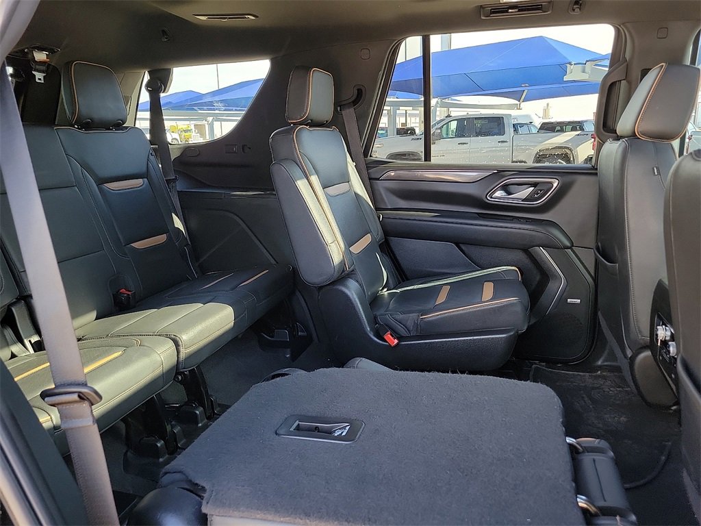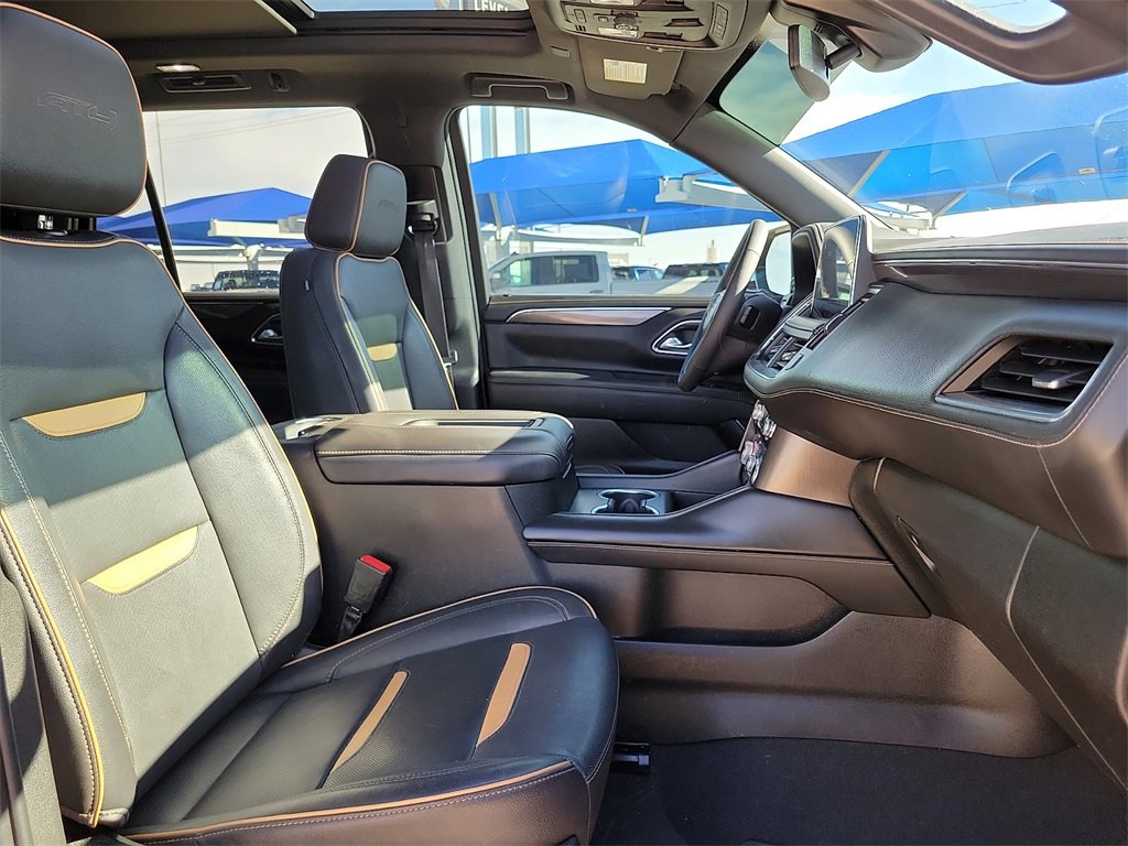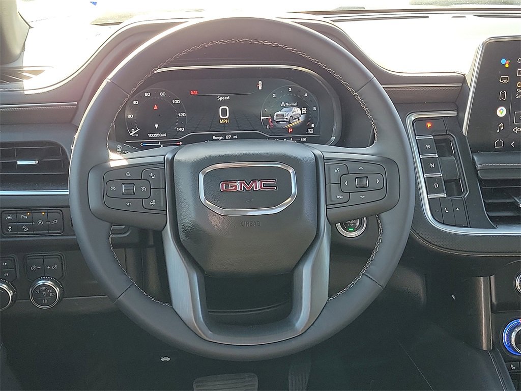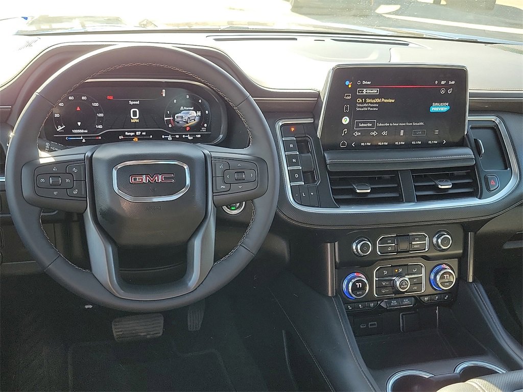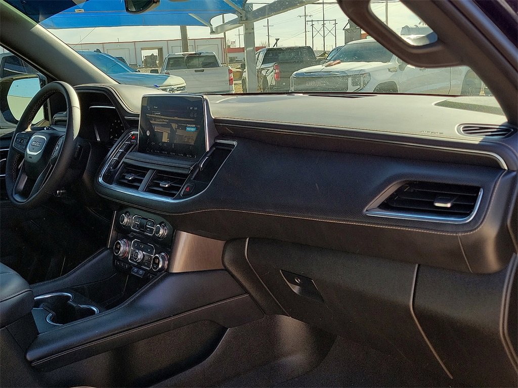 This 2022 GMC Yukon AT4 EcoTec3 6.2L V8 10-Speed Automatic with Overdrive 4WD in Onyx Black comes with the following features: 4WD License Plate Front Mounting Package, Preferred Equipment Group 4SB (2 Presets For Outside Rearview Mirrors, 3 Years of GMC Connected Services, 3rd Row 60/40 Power-Folding Split-Bench Seat, Automatic Stop/Start, Black Roof-Mounted Luggage Rack Side Rails, Bose 9-Speaker Stereo Audio System Feature, Bright Front & Rear Door Sill Plates, Front High-Approach Angle Fascia, Hands-Free Power Programmable Rear Liftgate, Heated & Ventilated Driver & Front Passenger Seats, Heated 2nd Row Outboard Position Seats, Heated Driver & Front Passenger Seats, Heated Steering Wheel, Heavy-Duty Air Filter, Hill Descent Control, Inside Rear-View Auto-Dimming Mirror, Outside Heated Power-Adjustable Mirrors, Power Release 2nd Row 60/40 Split-Folding Bench Seat, Power Tilt & Telescopic Steering Column, Red Horizontal-Mounted Recovery Hooks, Safety Alert Seat, Start/Stop System Disable Button, Universal Home Remote, and Wireless Charging), 4WD, 3.23 Rear Axle Ratio, 3rd row seats: split-bench, 4-Wheel Disc Brakes, 9 Speakers, ABS brakes, Adaptive suspension, Air Conditioning, Alloy wheels, AM/FM radio: SiriusXM with 360L, AM/FM Stereo, Apple CarPlay/Android Auto, Auto High-beam Headlights, Auto-dimming door mirrors, Auto-dimming Rear-View mirror, Auto-leveling suspension, Automatic Emergency Braking, Automatic temperature control, Brake assist, Bumpers: body-color, Compass, Delay-off headlights, Driver door bin, Driver vanity mirror, Dual Exhaust System, Dual front impact airbags, Dual front side impact airbags, Dual-Pane Panoramic Power Sunroof, Electronic Stability Control, Emergency communication system: OnStar and GMC Connected Services capable, Following Distance Indicator, Forward Collision Alert, Four wheel independent suspension, Front & Rear Park Assist, Front anti-roll bar, Front Bucket Seats, Front Center Armrest, Front dual zone A/C, Front fog lights, Front Pedestrian Braking, Front reading lights, Fully automatic headlights, Garage door transmitter, Heated door mirrors, Heated front seats, Heated rear seats, Heated steering wheel, Illuminated entry, IntelliBeam Automatic High Beam On/Off, Lane Change Alert w/Side Blind Zone Alert, Lane Keep Assist w/Lane Departure Warning, Leather steering wheel, Low tire pressure warning, Magnetic Ride Control Suspension, Memory seat, Navigation System, Not Equipped w/4-Way Driver & Fr Pass Pwr Lumbar, Not Equipped w/Front & Rear Park Assist, Not Equipped w/Heated Steering Wheel (DISC), Not Equipped w/Steering Column Lock, Occupant sensing airbag, Outside temperature display, Overhead airbag, Overhead console, Panic alarm, Passenger door bin, Passenger vanity mirror, Perforated Leather Seating Surfaces, Power door mirrors, Power driver seat, Power Liftgate, Power passenger seat, Power Release 2nd Row Bucket Seats, Power steering, Power windows, Power-Retractable Assist Steps, Rain sensing wipers, Rear air conditioning, Rear anti-roll bar, Rear Cross Traffic Alert, Rear reading lights, Rear seat center armrest, Rear window defroster, Rear window wiper, Remote keyless entry, Roof rack: rails only, Security system, SiriusXM w/360L, Speed control, Speed-sensing steering, Split folding rear seat, Spoiler, Steering wheel memory, Steering wheel mounted audio controls, Tachometer, Telescoping steering wheel, Tilt steering wheel, Traction control, Trip computer, Turn signal indicator mirrors, Variably intermittent wipers, Ventilated front seats, Voltmeter, Wheel Locks (Set of 4) (LPO), and Wheels: 20 x 9 6-Spoke Machined Aluminum.